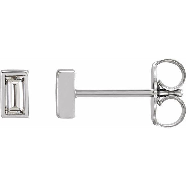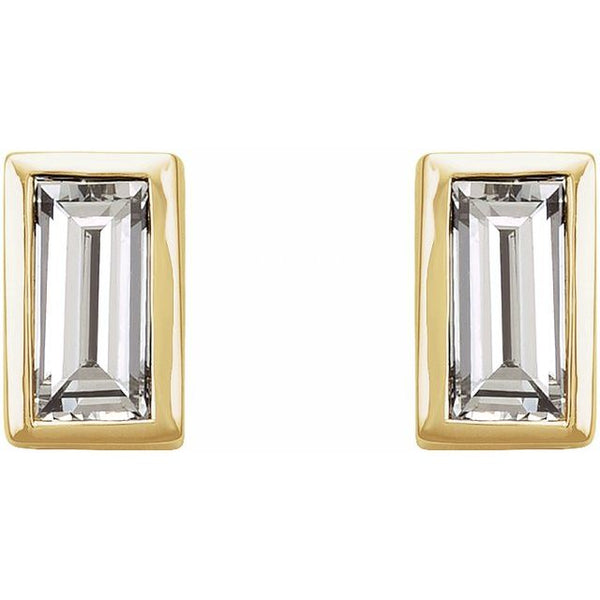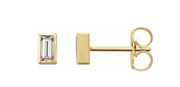 Our Baguette Diamond Stud Earrings feature near colorless baguette diamonds that are flawlessly encased in their 14kt gold bezel prong setting. The perfect addition to your ear piercing stack. Available in white or yellow gold.